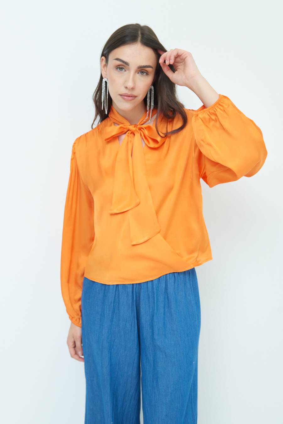 Casacca incrociata in raso di viscosa con fiocco sul collo e arricciatura sulla spalla.La modella è alta 1,75 e indossa una taglia S/MMade in ItalyComposizione: 100%viscosaColori disponibili: rosa, mandarino, polvere, blu, verde, burro.