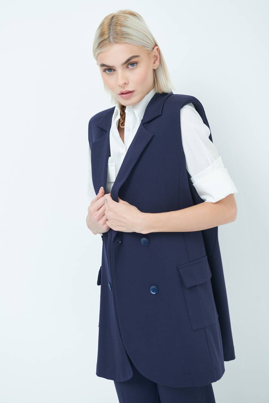 Giacca smanicata a doppiopetto con tasche e collo revers.La modella è alta 1,75 e indossa una taglia SMade in ItalyComposizione: 65%viscosa 30%poliammide 5%elastaneColori disponibili: beige, burro, verde, nero, lilla, celeste, verde.