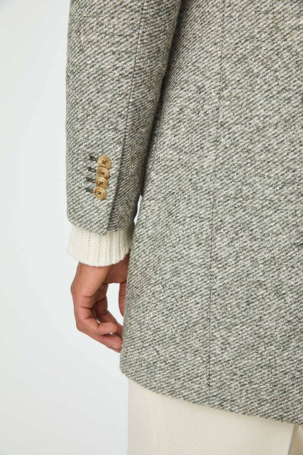 Cappotto da uomo monopetto con tasca a toppa e tre bottoni a contrasto realizzato nei toni del verde pastello che si intrecciano alla nuance neutra dell'avorio per dar vita a una texture tridimensionale. Classico, pulito ed elegante questo capospalla si presta a numerose combinazioni di stile.