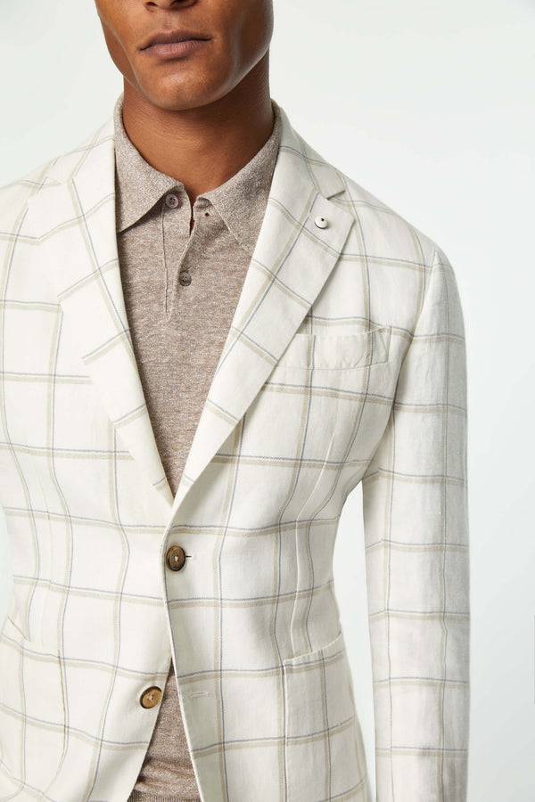 Giacca monopetto da uomo realizzata in 100% lino nei toni del bianco avorio. La fantasia finestrata di questo blazer crea movimento e aggiunge il giusto tocco di personalità a questo capo perfetto per essere indossato anche d'estate.