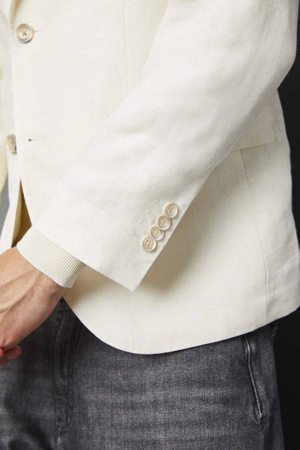 Giacca da uomo monopetto nei toni del bianco con rever classico e taschino a barchetta sul petto. Grazie alla preziosa mischia di lino e cotone questa giacca si presta per essere indossata nelle fresche serate estive, un capo intramontabile e dal gusto elegante e minimal nello stile della capsule colletion Blackout.
