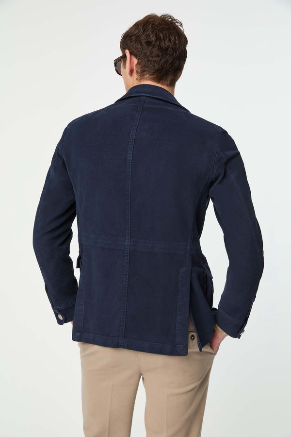 Giacca sahariana nei toni del blu notte con bottoni satinati color argento in cotone leggermente stretch. Il collo a camicia rende questo capo casual e sportivo mentre la tintura in capo, che caratterizza questa giacca sahariana da uomo, dona al capo un effetto old/lived-in unico.