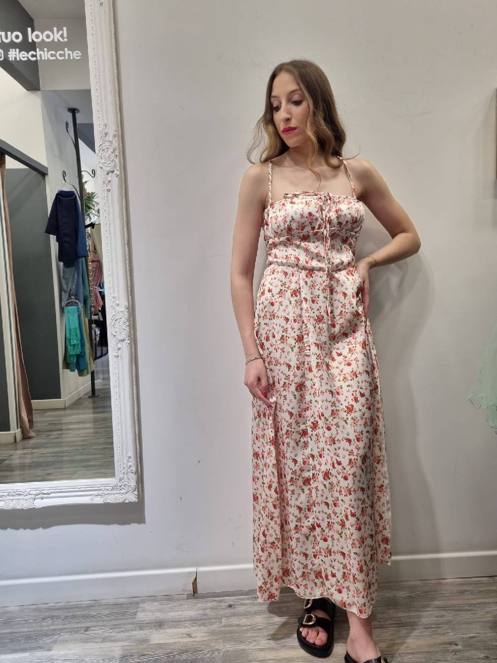 Abito lungo, coppa preformata, elastico avanti regolabile, bustino e bretelline regolabili con le stringhe, fondo burro con fantasia floreale, taglia unica veste fino a una taglia 42/44.