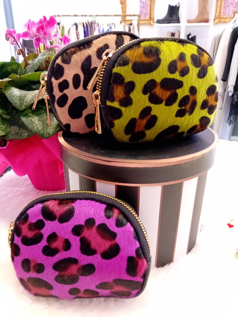 Borsellino vera pelle made in Italy, fantasia maculata in lime, beige e viola da un lato, l’altro lato nero, cerniera gold.