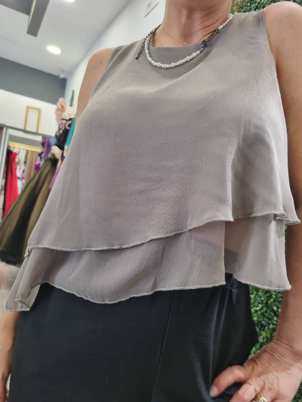 Top colore muschio, doppia balza asimmetrico, vestibilità regolare.