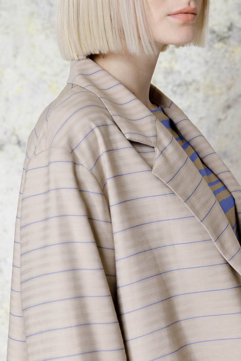Casacca lunga senza botton con collo rever. Profonde tasche ricavate sul davanti. Spacchi sui fianchi e tessuto in leggera viscosa tinta biscotto chiaro con delicate righe turchesi.
