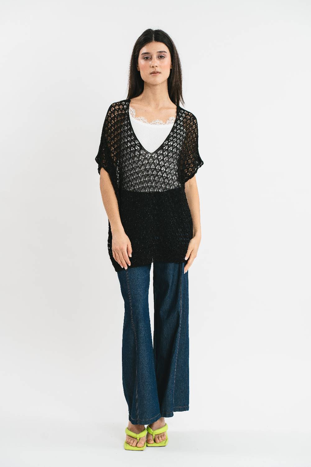 Maglia kimono oversize traforata con filo lurex e svollo a V