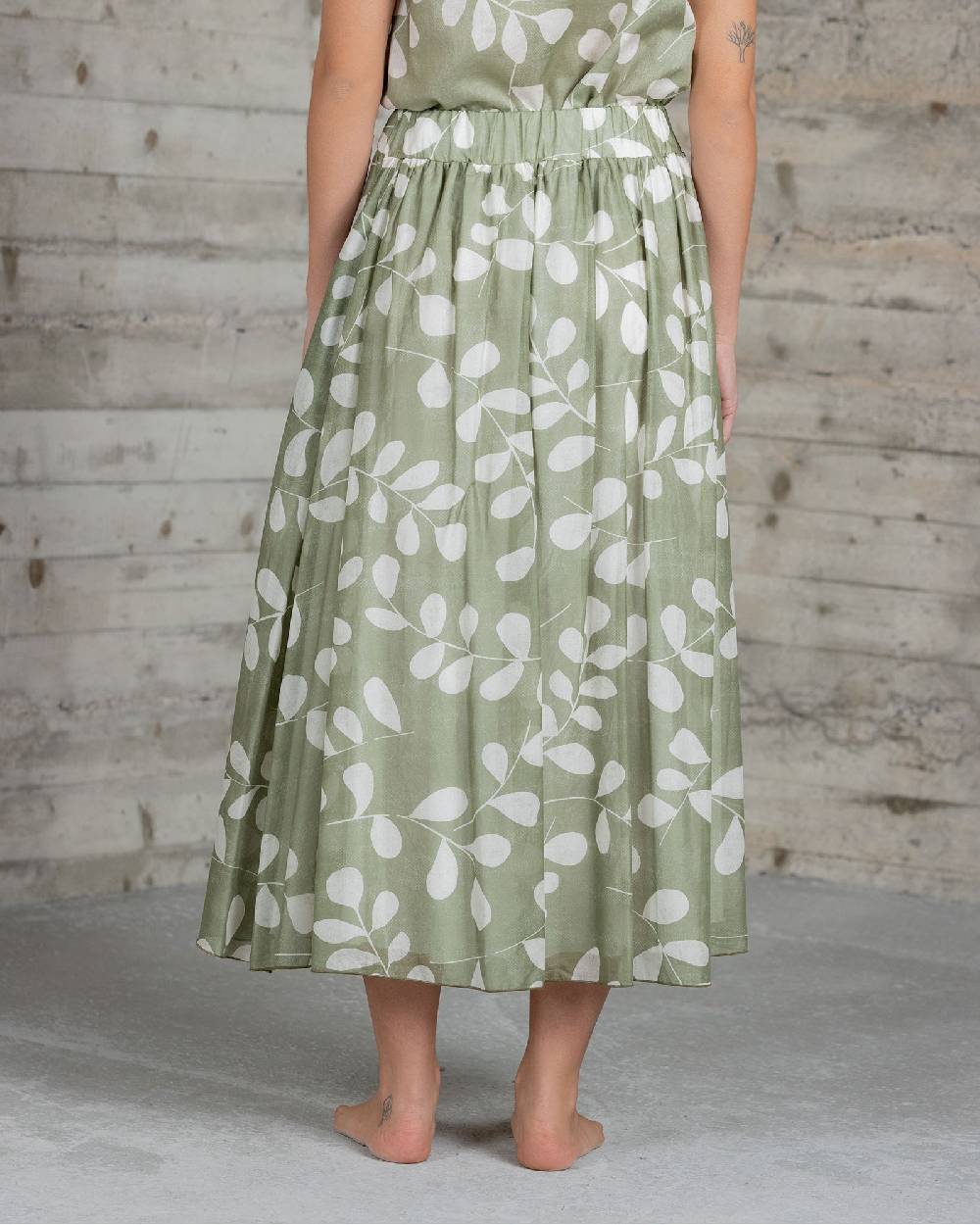 - gonna ampia in fantasia a foglie bianche, base salvia