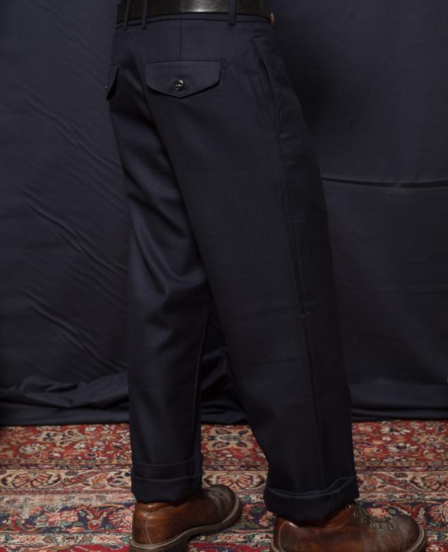 Pantaloni con gamba dritta e a vita alta. Presentano una patta con zip e chiusura con bottoni, tasche laterali lungo la cucitura, una tasca portamonete sul fianco destro e due tasche posteriori con bottone. Rifinito con bottoni in corozo e intarsi in chambray. Prodotto in Italia