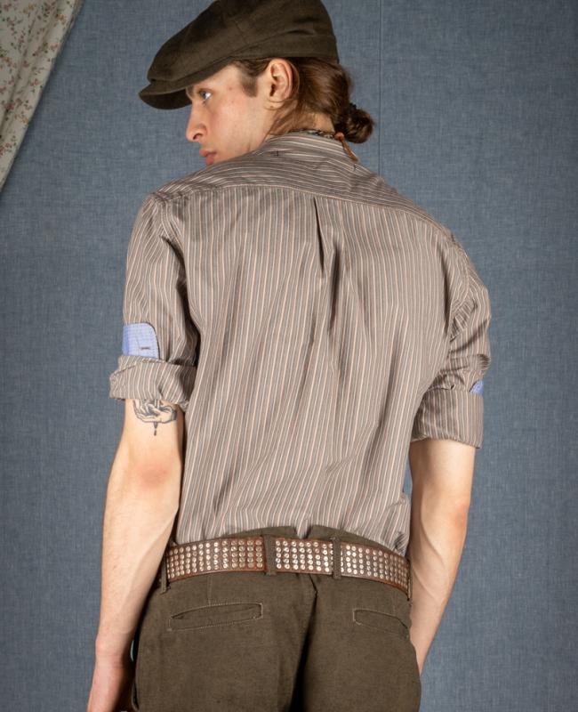 Camicia con colletto tondo e pettorina. Rifinito con bottoni in madreperla e intarsi in chambray.Progettato e prodotto in Italia