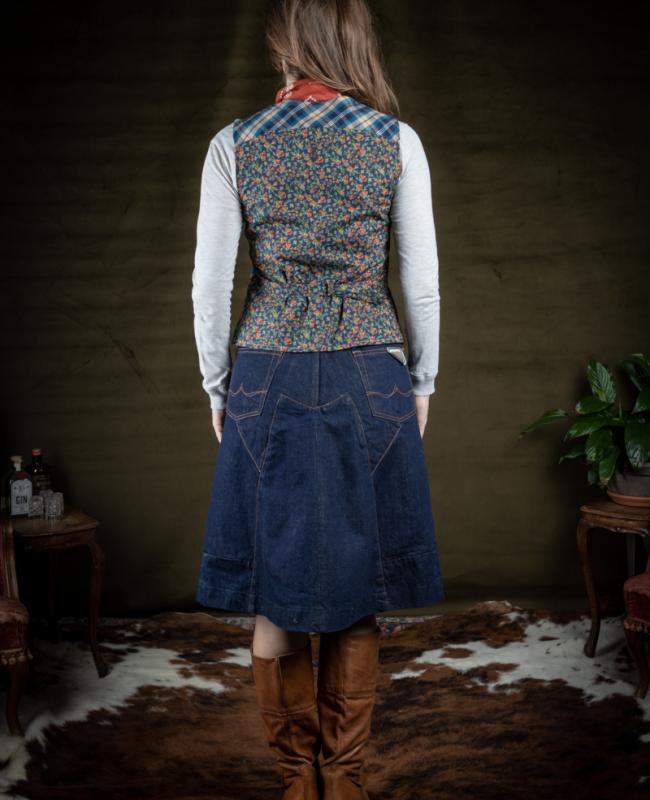 Gilet classico a 4 bottoni con due tasche a soffietto in vita e fibbia regolabile sul retro. Internamente foderato.