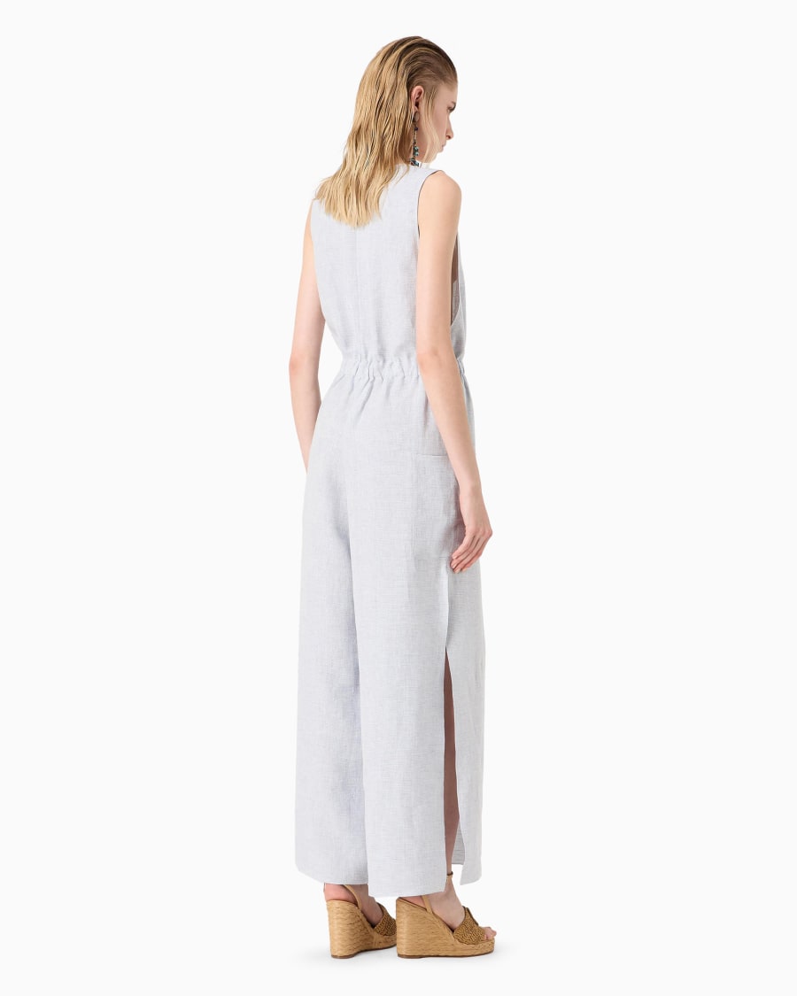Leggera e fresca tuta, realizzata in canapa millerighe, caratterizzata dal profondo scollo a V e dalle due tasche applicate. Il modello, senza maniche e con arricciatura in vita, è perfetto per completare look décontracté e ricercati dallo spirito vacanziero, in abbinamento ad altre creazioni della proposta resort.